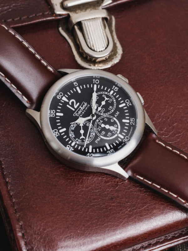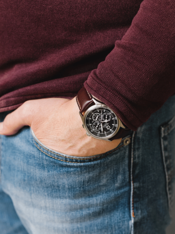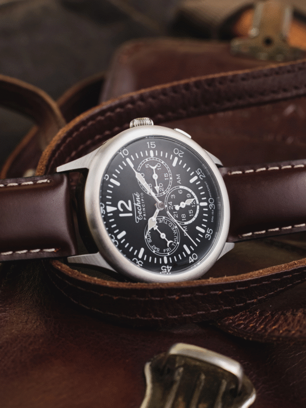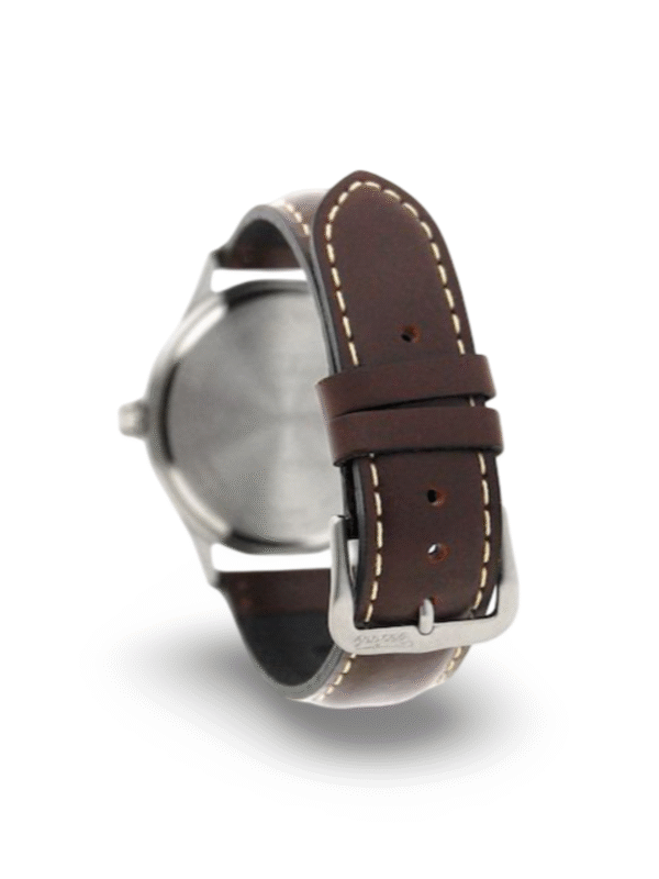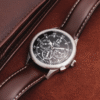 Every MR LANGFORD piece reflects our commitment to superior craftsmanship. The Merlin Twintime’s corrosion-resistant 316L steel case guarantees longevity. The durable Tuscan leather strap is meticulously crafted, aging beautifully over time. To maintain the leather’s quality, avoid prolonged moisture exposure.