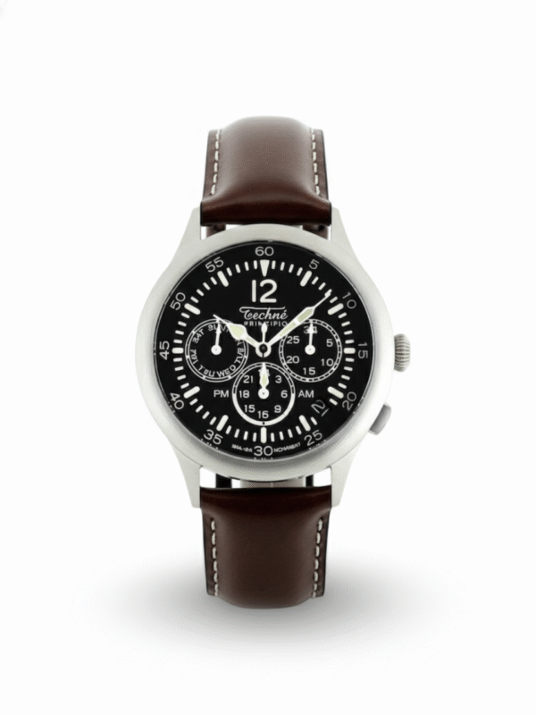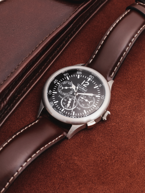 Named after the powerful Merlin engine of the P-51 Mustang, this collection is built for those who appreciate engineering heritage and optimal performance. Its broad dial and luminous hands offer unmatched readability, while the retro double-curved crystal adds a touch of early 20th-century aviation charm. This is a navigation watch for the modern pilot.