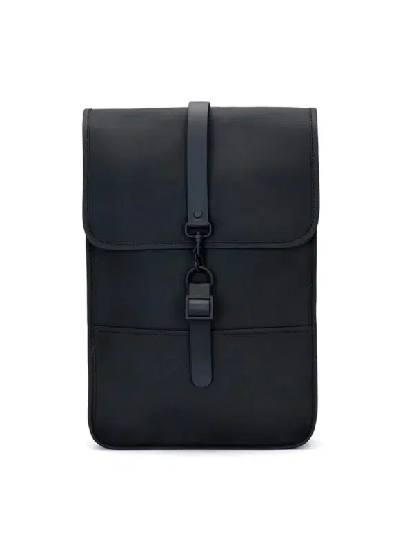 • Design & Security: Features a clean, plain pattern with a flap closure secured by a metal buckle/hook closure and magnetic snaps (as seen in Image 3). The main compartment is secured with a full waterproof zipper.
